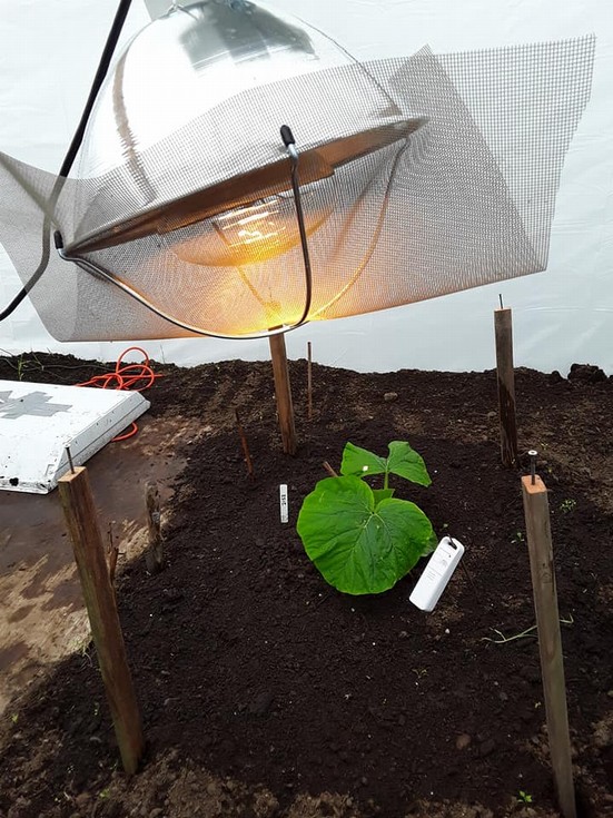 The heat lamp is not without its issues however. You have to be really careful not to toast your plant. I have also had two bulbs explode. The second one caused a couple of glass shards to rip small holes in the leaves. I believe the issue is moisture. Condensation collects on the plastic of the greenhouse and then when the wind blows it literally rains inside. There are some small vent holes in the reflector and I think water got through those holes. The temperature shock of the cold water on the hot glass caused the explosion. I fashioned a shield to keep water away from those holes. Hopefully that does the trick. I also added some old window screen as a safety net to catch any breaking glass from future explosions. I am also looking for a more water resistant heat bulb.