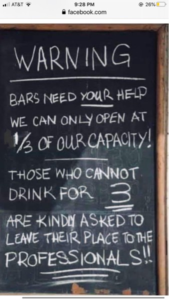Our bars are getting set to open with a few restrictions. I guess I will be allowed to enter !!