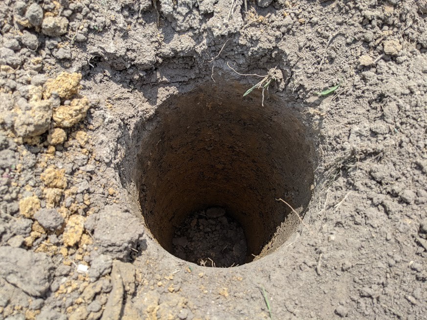 This is what I'm planting into. Just a little black dirt over clay. If I did deep enough the clay turns from red to blue but no punching through any hardpan here. Sloped garden drains quickly which is good in some cases but hard to keep proper moisture when the summer drought hits. Trying something new this year. Augering out several holes and filling with dirt/potting soil mix to hopefully act as a retention spot for some moisture as our summer goes on that the roots can find.