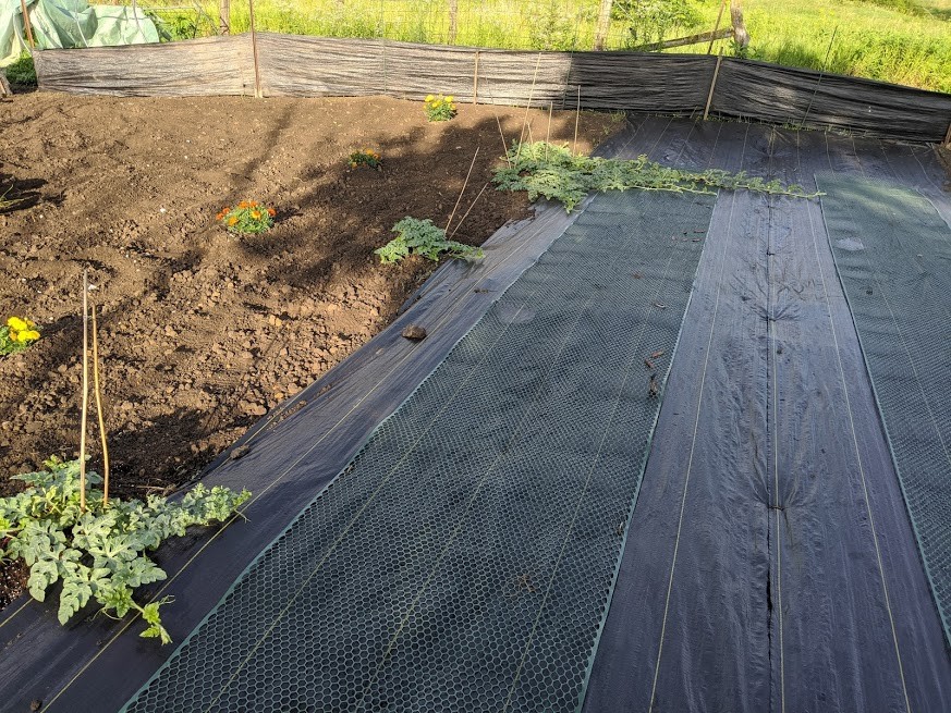Added some plastic poultry fence for the watermelons to hang on to. Will do the same for the cantaloupes.