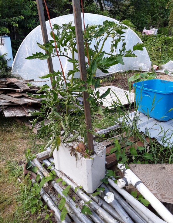 Tomato in the 5 gal toilet reservoir. Only a nice big single and a smaller single so far. There are some triples coming up but I do think the roots are maxed out. It might require a half gallon a day of water. Kind of a pain to have to water it every day. Other than that its doing nearly as well as the ones in the ground.