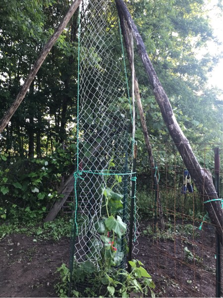The new improved Gourd trellis has some company starting to stretch up.