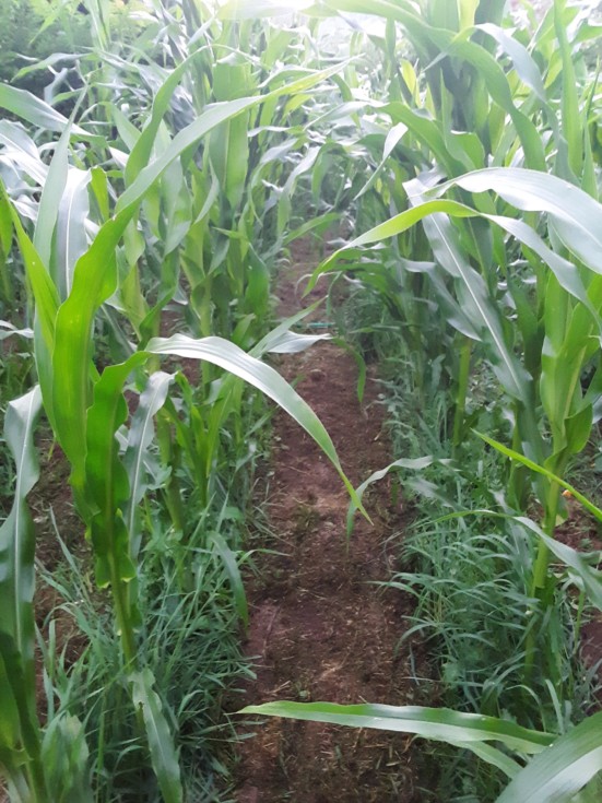 Mowed between the corn rows.