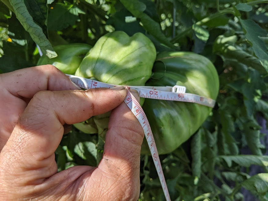 Measured a couple of the biggest tomatoes currently in the patch. Ways to go before they're noteworthy. Hopefully they grow some more to help out the challenge team now that Chris Brown gave us a good pace setter. This one on the 5.71 Lambchop.