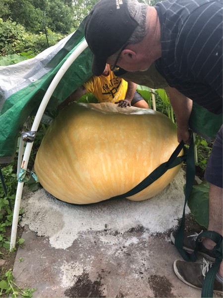 The good news was the 1885 werner liked the monsoon. Thanks to a suggestion from andy wolf I was able to pull her back a few inches to relieve the kink in the stem and avoid serious vine stress. With the help of friends andy and tom we placed our lifting straps low on the pumpkin, angled a pry bar in the soil and while tom and I pulled and andy pushed we slid it just enough.
