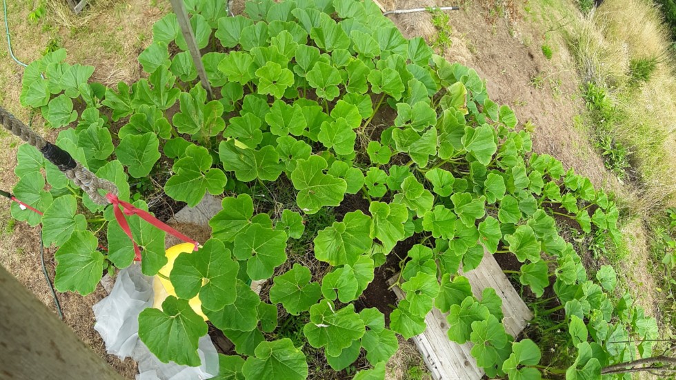 Here is an aerial view. I counted 250 leaves. The plant could fit in 150 ft I think. I've got a vine problem now. We will see how it goes. This plant had no heating and it was a cold spring. Plenty of time for it to grow though. Finally killed the mole. Nutrition looks ok to me... soil might be getting acidic though.