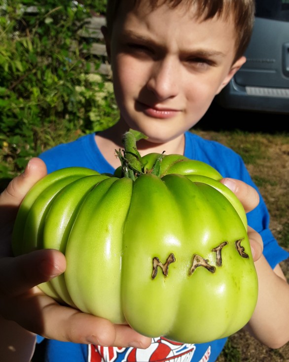Awesome tomato there, young man! We figure it weighs 2.0 to 2.5 lbs... didn't get a weight on it so hopefully my other singles keep growing.