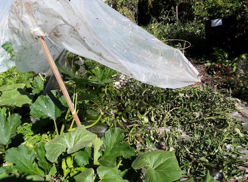 There is a lot of plant behind the tomato. Looks terrible but there's probably 30 sq ft of plant there. All the suckers are removed.