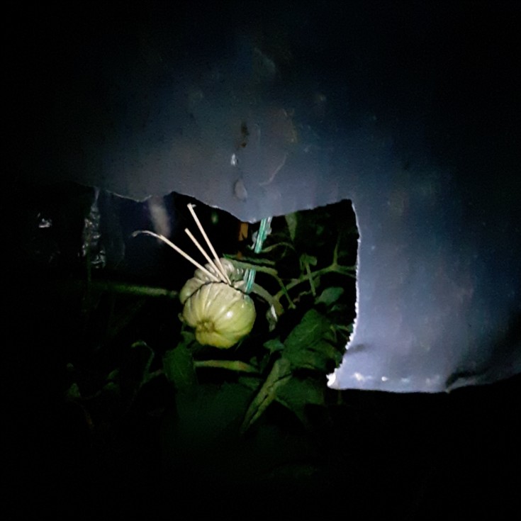 Chinese tomato torture with bamboo. Has not stopped or slowed the growth... But it was getting very awkward. I will probably switch to short cedar wedges. I have no clue where this tomato will fail, or if it will make it. I have a couple other doubles set. We ARE having an Indian Summer so these late August sets may stand a chance. Not going for ripe. Just going for green & big by Halloween.