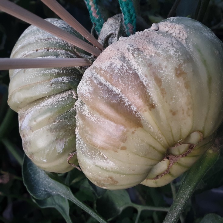 Ugh... This is sloppy sulfer plus dew equals acid... Acid plus sunshine equals brown skin? I think the tomato is young enough that it can heal... but crap, u know? I had this happen one other time. Read my diary & learn what NOT to do.