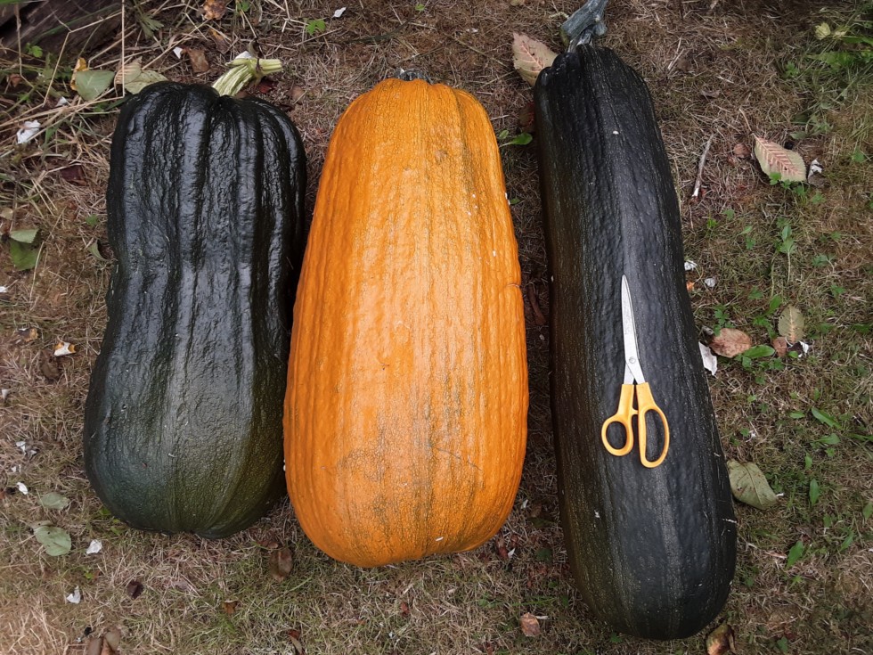 Talk about a Black Beauty... the Rod looks like a real zucchini. 11 kg. I did cross Mobey the Whale (middle) and the Rod. Dennis the Rod is x self so lots of options but no clue how to proceed. Maybe the smooth zucchini genetics could help the marrows be less prone to splits... or field kins could grab a little extra length. It's all just silly until it actually works. Anyhow it was interesting to get two variations. The Rod was grown on zucchini plant #2. The Whale was grown on zucchini plant #1. Dennis the Rod would have made a decent entry to the Puyallup Fair giant vegetable contest. Too bad.