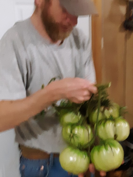 Tomato truss... new personal best. 7 tomatoes... 9.51 lbs. This plant had other fruit on it and was also competing with two other plants. I wrote this plant off but nevertheless it performed well. I am not optimistic about getting all that weight into one tomato... but at least this shows me where I need to focus my attention. This one had a damaged stem prior to the truss and I wonder if that's part of the reason it pushed this truss so big. Might have "girdled" the phloem.