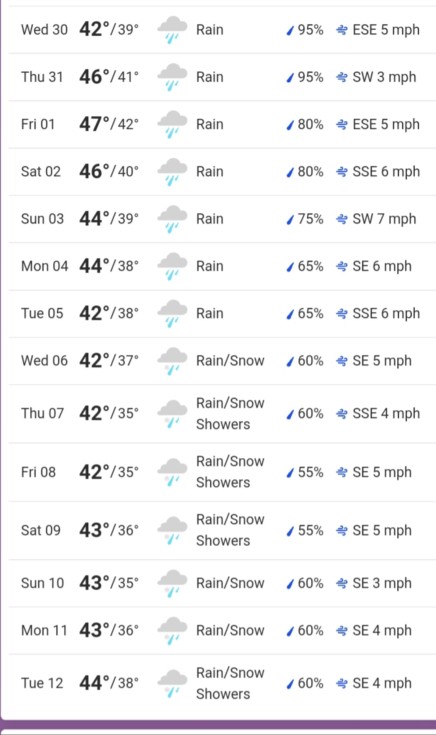 Exciting forecast. 26 last night. Probably the coldest night so far. Half inch of ice on a 5 gal bucket. But basically no winter here the buds are swelling already.