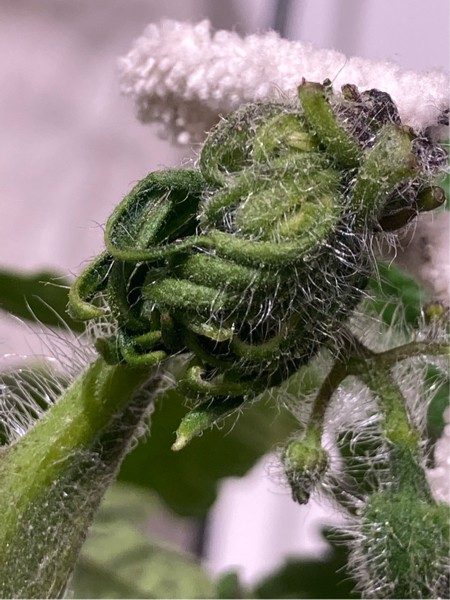 The first blossom of the winter is looking promising. I am guessing a triple. Unfortunately the ribbon blossom stem was twisting to point the tomato towards a place that it wouldnt have space to grow. I am trying to nudge it in the right direction with a pipe cleaner. I think I heard from someone about a rule of not touching your blossoms�I cant remember.