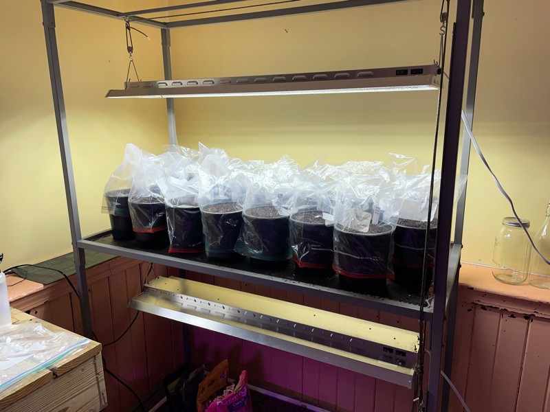 Plant bench is happy with 20 one gallon pots sitting on our big heat mat. The bags just help to keep the moisture in. I just soak AG and long gourd seeds with a 50/50 water and hydrogen peroxide for 3 hours and the plant directly in pre warmed one gallon pots. Need to add a pinch of patience and put out a sign to remind me not to dig in the pots!