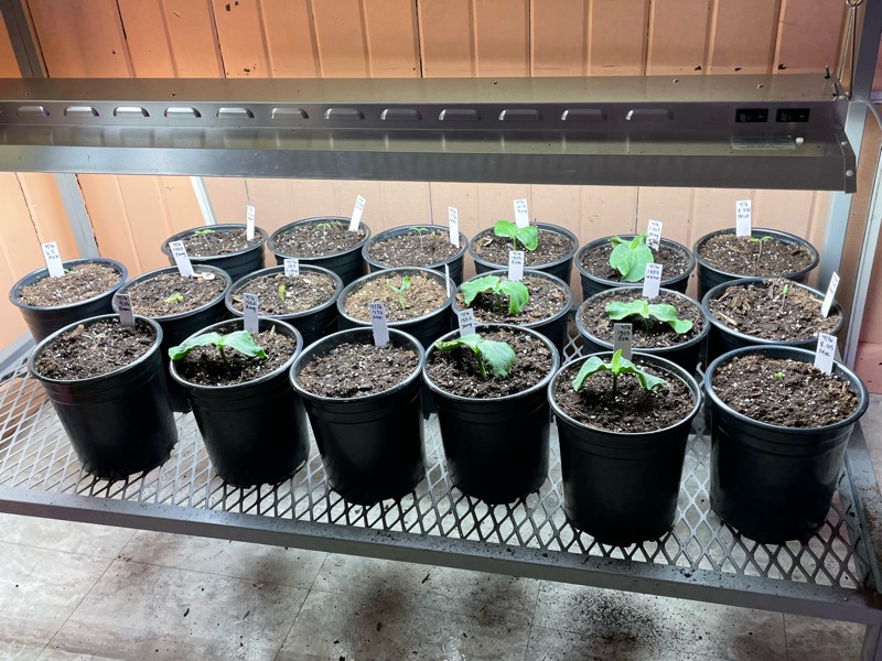 First Sunday update of the year. All 8 pumpkins: 1885 Werner, 1905 Rose, 1552 Young and 1469 Young and back ups are all emerged and showing sign of first true leaf. Nine out of the 10 tomatoes germinated and one 157.75 C Ansems and one 152.25 Yohe are up too.