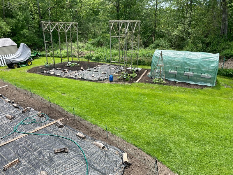 The old patch is also uncovered but we still have a pumpkin decision to make here. Tomato cave is planted and both trellises have long gourd plants.