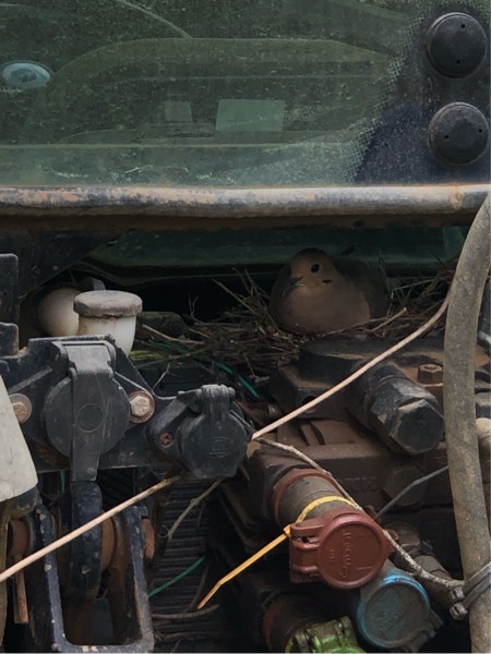 Lol� I�ve never seen a morning dove nest before�too funny. This week he took the baby for a ride�he went easy on the bumps and the momma is back on the nest.