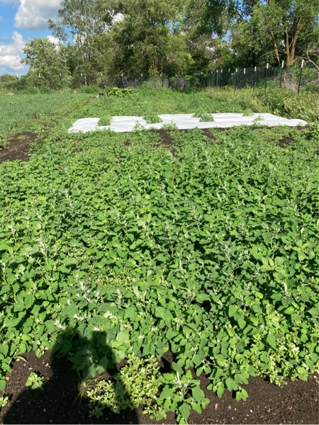 I think I have a weed problem. But thinking positively�my weeds have never grown this fast and looked as healthy before. I must have made some soil progress this spring. i am not going to till these in. I need the roots to hold what i added. i am going to just mow.Too much washes into the drive during heavy rains with bare soil. 150 sq ft plant in background.