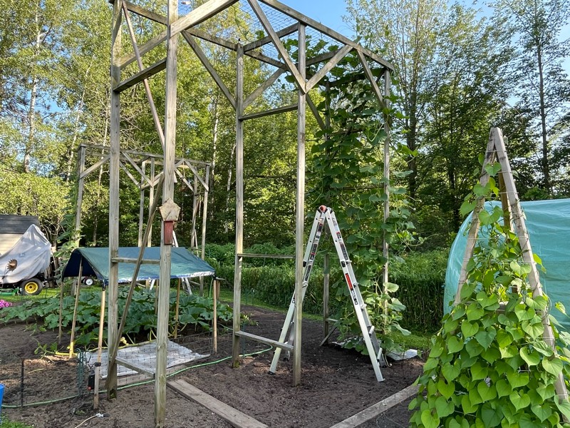 Here is the 152 Yohe long gourd around 20 feet long tonight. There are immature females in the right zone that should be ready to pollinate by mid week. Pollinating long gourds is challenging as they bloom in the late evening and are very fragile. In addition , the plant is also 15 feet off the ground.
