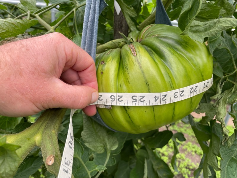 We have a few decent tomatoes growing for us at least and our little backyard patch. This is a single bloom off of the 8.35 Strickler and has a circumference of 26 1/4 inches.