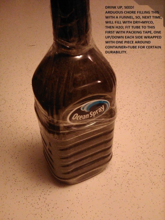 Please read the texts within the pics to get an idea of 'how to' or at least what went into this device; A gallon Airizonuh Tea jug X 2 was my initial choice butt that is LOT of SS mix, so, I went with the OS juice containers. Amazing that I've had that clear tube for about 30 years and that the containers, both used or not, matched up perfectly with this! In fact, a gallon AT jug will fit into or be fitted with an OS 64 oz.! FYI for later...