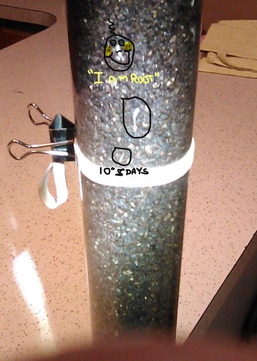 Well, rolling right along here at 10 inches from where I believe the roots do start; Silly me went to water it tonight and forgot about the cut corners (lol) of the upper container. A little cleanup, no biggie - I'd expect the tube with a clamp around it to be basically water-tight. It is doing well, and that is what matters. eg