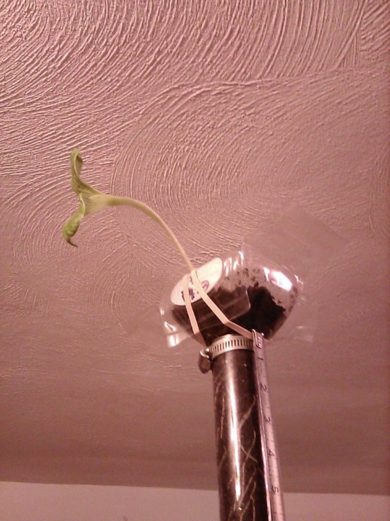 This pic came out so well I didn't even edit it. It's a view from down on Earth as the Monster Pumpkin Invaders look over their new root zone, lol. Hey, if I can walk and yet tip over maybe they can tip over and therefore walk. I did look for pumpkin monster movies and there are a few that I'd watch for laughs and maybe 1 or 2'd be scary; The rubber bands on the top container came in REALLY handy to direct the plant's initial growth! Later---eric g