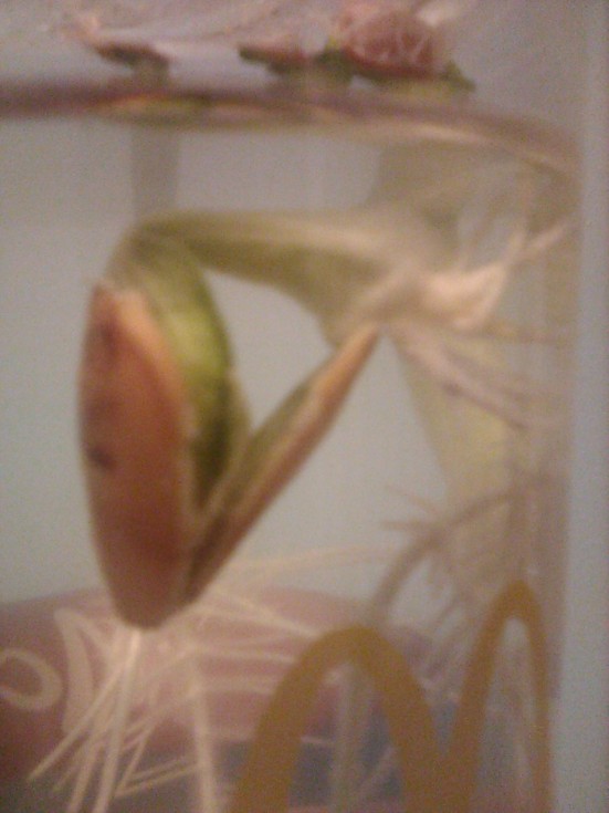 In having fallen out of or dropping from the lid into the water, I wonder, if this had been in the soil, or just in general butt we don't see it, could this prybar action of the seed occasionally help it out of its shell? This IS the one I had snipped all the weigh around and that had the smallest roots of the 4. Odd or coincidence? It also did not sink like a rock - Air bubbles in the roots kept it afloat and I had to do a bit of swirling to get 'er done. Err, down.