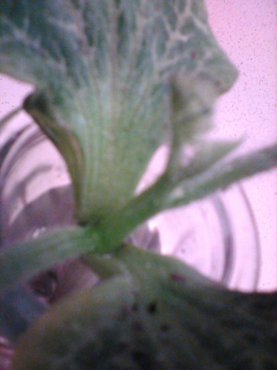 Terrible pictures I do take with a cell phone, but Oh, well! The wildly-submerged and tormented plant I had in a vase got to this level of growth even though the submerged roots did not like their submergence after a week or so - My belief is that with circulation and proper hydroponic apparatus, all would be well;\ I have seen it done before, of course on BigPumpkins.com, with massive rooting results!