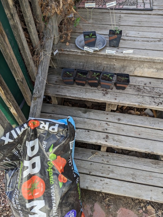 Time to add dirt to the leggy little tomato sprouts. This week I will start hardening then off as it looks like great weather this week.