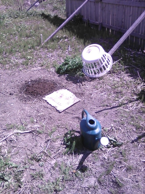 Here is or are the standard Gerry pumpkin putout items, minus the WeedBlock just to get them in the ground, pronto! I usually use TWO clothesbaskets, butt I had not noticed, or rather forgot, that I was down to only like 8 of each kind, so, limited protection this year for the first 16 plants, lol; A basket provides: Wind protection - somewhat, critter protection - somewhat, sun protection - sideways, somewhat and from above - dramatically; Doubling-up of them doubles-up the protection of 2 out of 3; The plywood piece will go on top of the basket soon - for now, it is the plant's morning or afternoon sunblock. SHOULD have supplied two per plant; eg