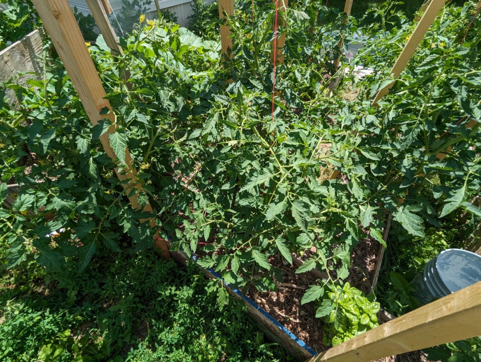 OMG!!!! Tomato Plants Gone Wild!!! I skip a day or two and the plants have a hey day. 4 plants and I don't know where one starts and the next one ends. 3 of these are not pruned yet waiting for something I like a mega or fruit set. Obviously these plants need to have some discipline. A stern talking to about making sure who witness your blooms. :)