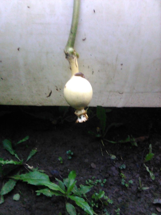 Well, I don't know about Howie Dewitt, butt this is how I'm doin' it this year with the Blossom-Down, 'Got me over a barrel' Method. Thanks to Little Kins for prompting me to do SOMETHING Blossom-Down and that was like 3 weeks ago or more. At the time I had about 5 plants with no pollinations on them yet. This one on my 443 plant X Open just...presented itself on a long, miscellaneous secondary and was like 'I ain't busy tonight...' 'Well, I have all these barrels that aren't busy either, and...' Voi-Lah!!! Roll out the barrel--- Funny as heck - I scanned around my back patch today and at first glance at this from the other side for once, 'What the...' "OH>>>It's the barrel. Ohhhhh"....lol----not another giant fruit, lol... This is my second attempt on a different plant - the first one aborted, probably because there were two others on the plant already (the double-vining 206.1, previously-pictured). eg