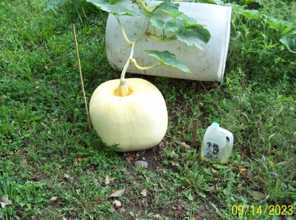 The squash in the previous pic has aborted butt I should still get any seeds that are not too far gone. Pfffttt... Well, here is that 1541.5 McMillin final fruit that I grew 'Over A Barrel'-Style! Should be a Helluva cross: (1541.5 McMillin X 301.5 Gerry '05); The ring around the Rosey is from a recent watering/rainstorm and raises concerns of if it'll start to rot there. I should douse it with Clorox and water @ 1 Tbsp. Gal...maybe...eg