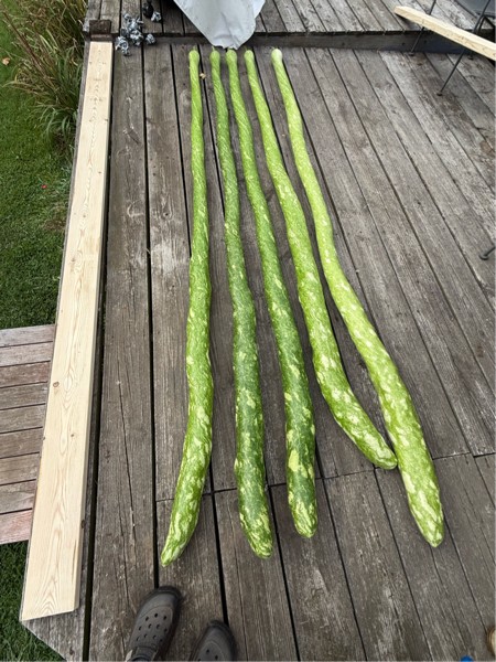 Harvested long gourds. Maybe I should have done a better job pruning off a few of them!