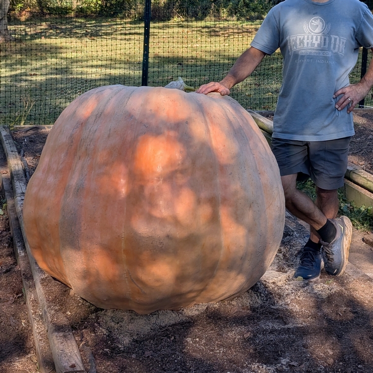 The final 'product' of my first try growing a giant pumpkin. 1526 Miller seed, plant grown across two raised beds and a ground-level side bed. Total of about 300 square feet to root into plus a fence to grow up on. Pumpkin grown on a side vine after the main broke in a wind storm. Pollinated July 4th. Final OTT 313.5 (722 pounds) measured in its growing position, 322 measured once we were able to stand it up. Pretty happy with the outcome, and it sure was fun watching it grow.