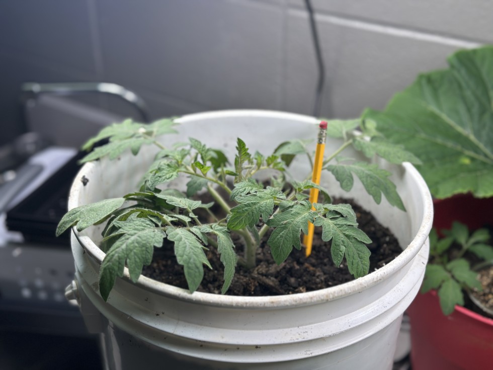 25 days out of the dirt and exactly 4 weeks since starting the seed. I like the thickness of the main stem. I wish my bucket was clear so I could watch the roots grow. I may look into that. This is my first tomato plant, so I have no idea when to expect a bloom.