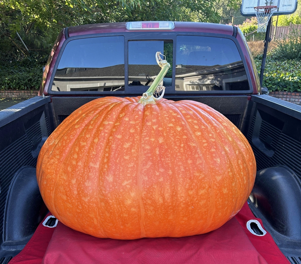Tweedledee - My favorite pumpkin from 2025. 477 pounds of leopard orange perfection. Grown on the 1366 Zunino with two other fruit on the same plant...