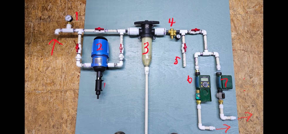 Wish me luck! I made this yesterday. It's a system based on a Newtry "Dosetron". 1) inlet of fresh water from a city tap which has been reduced to 50 psi to protect components. 2) dosetron which will proportion the liquid fertilizers. Adjusting the valves will allow the system to bypass the dosetron. 3) water filter 4) a pressure reducer set at 12 psi for the recommended pressure of the drip tape that I'm using. 5) By adjusting the valves we can take a sample of what the dosetron is spitting out to adjust pH and concentration. 6&7) On/off battery operated timers ...1 for each plant. Usually I've been watering every 4 hrs but this year we are watering twice a day for a deeper soak. 8) These are not numbered and are water meters attached to the outlet side of water timers. Lets hope the 80 plus joints are water tight !!! This powerless watering and fertilizing system should free up valuable time for life's real activities lol.
