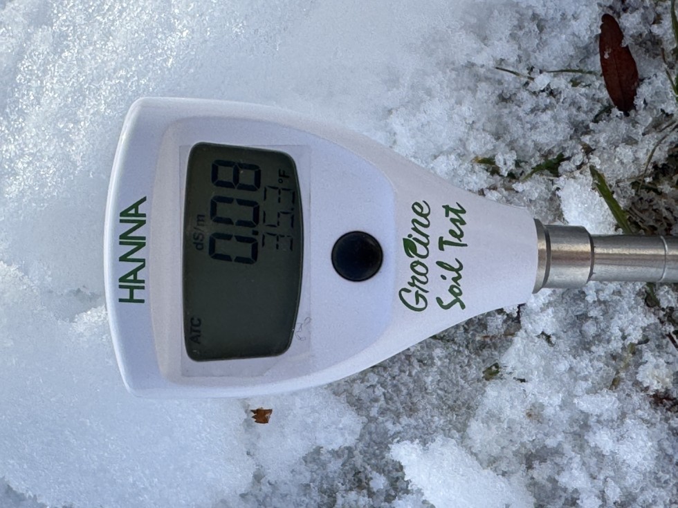 The plastic is doing an incredible job. Despite the freezing air and snow, I measured the soil temperature under the tarp and was thrilled to find it at a balmy 49.3F!