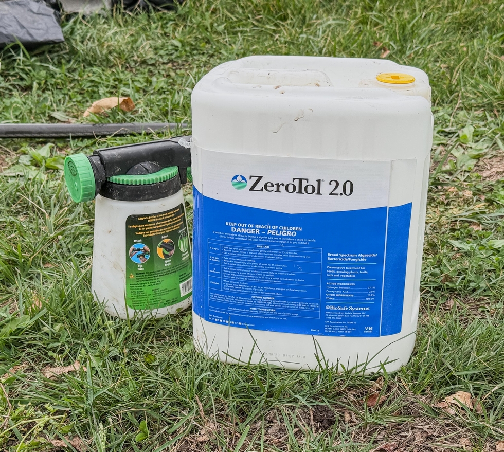 In the past I have used concentrated hydrogen peroxide as a soil drench to help eliminate any soil borne diseases. New this year I am trying ZeroTol. It is similar to the H2O2, but also contains paroxyacetic acid, which has a longer antimicrobial effect in the soil. This all breaks down to water, oxygen, and a small amount of vinegar. The vinegar also has an antimicrobial effect and breaks down in a few days so should not effect pH. I'll add beneficial microbes back in when I amend the soil here in a few days.
