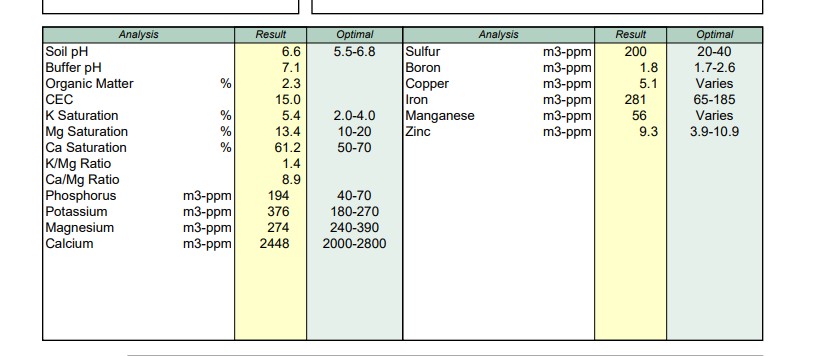 Looking at my spring soil test I don't think I am in terrible shape. I knew P would be high due to overuse of manure on this site, hopefully that does not prove to be problematic. I am somewhat puzzled that the Ca did not increase more, I pulled a test in Oct and Ca was 2300 PPM, then I added 900lb gypsum on 6000 sq ft and this spring Ca has only increased by about 150ppm. I wonder if it is a matter of being too cold over the winter to react with the soil. I will be interested to see the level on my next test in a month or so.