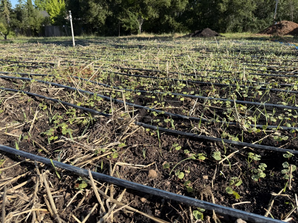 Buckwheat cover crop is coming in nicely. The goal is to let it create a thick carpet. Then I will selectively chop it where the vines go during vine burying. Benefit is keeping roots in the ground working with the microbial life and creating soil aggregates. Also it should help with weed suppression and moisture retention (important in my climate).
