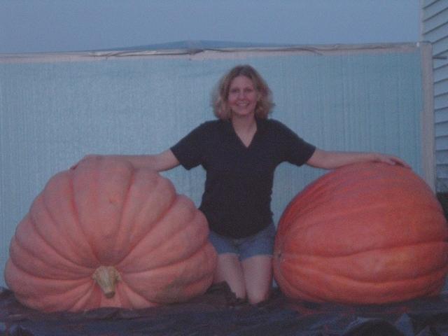 My wife with the best pumpkins of my first season. In the background the blue box is an air conditioned storage I constructed to try to keep my pumpkins in good shape for Halloween display. The crazy things a pumpkin grower will do.