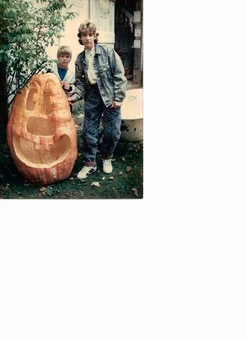 This photo was taken at Len Stellpflug's house in October of 1988. It was our first experience with Atlantic Giants and we have been hooked ever since! My brother Jason McKie on the left and myself (Dan) on the right, with a 300lb est. carved Atlantic Giant