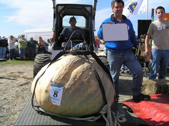 George D. Ottone displays his 504 pounder at the Frerich Farms 2006 SNGPG Weigh-off. I thought it wasn't supposed to be a beauty contest...but George won the ugliest pumpkin entry this year. She sure looks heavy withall that cantelopeing. Oh Well....