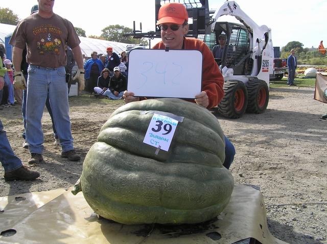 Alan Reynolds of Durham, CT entered this 342 pound Giant Squash at the Frerich Farms SNGPG weigh-off Good for 3rd place. Alan apparently grew 4 GIANT SQUASH this year and entered 4 different Fairs with them. Go Green!