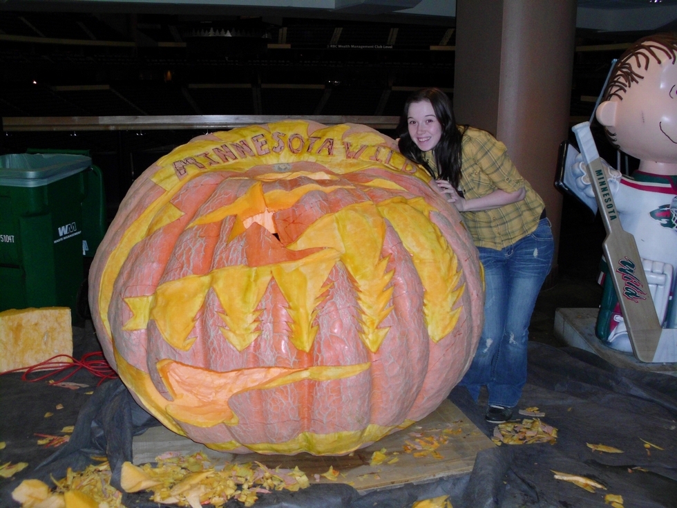 Well the WILD marketing guy who helped set this things up wanted the wild logo on it. Honestly I’d rather have put a big scary monster face, or 3 of them, on it. The WILD was however giving a venue to display the Pumpkin, and so they get what they asked for. Not an easy design to do as it’s a D dimensional multi design symbol, and its being carved into a 3D round and ribbed object. Chelsea here likes it.
